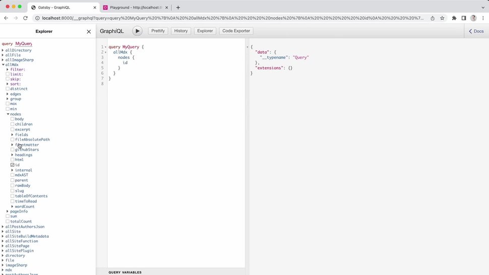 From Graphql Playground we can grab a type that used for markdown files, which will be Mdx, and then add a new field this way.