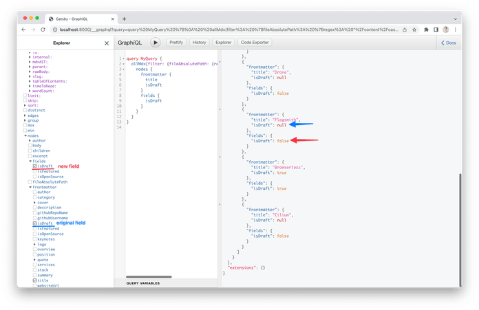 This code will be invoked on each Node creation, so it’s good to filter nodes there by certain parameters to add a field only to the relevant nodes. It’s a quick solution, but it is a bit raw. As you can see, the original isDraft field from markdown frontmatter data remains untouched, and we create a new one in that node under fields directory.