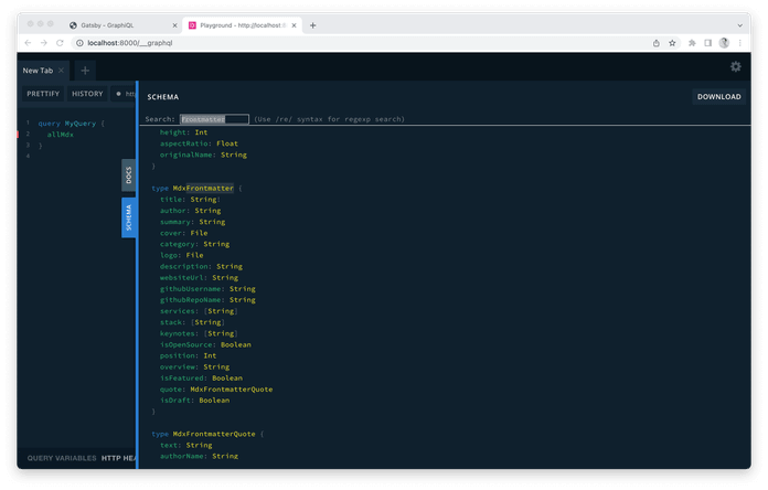 From Graphql Playground we can grab a type that used for markdown files, which will be Mdx, and then add a new field this way.