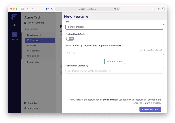 Let's create our first feature, we will name it - "pinned_projects". Beta users will be able to pin projects and see them.