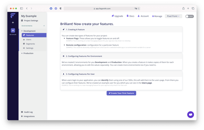 The configuration process is simple. Once you've signed up, create a new project. In Flagsmith you can define multiple environments per project, each environment keeps its own features/users/segments and API key.