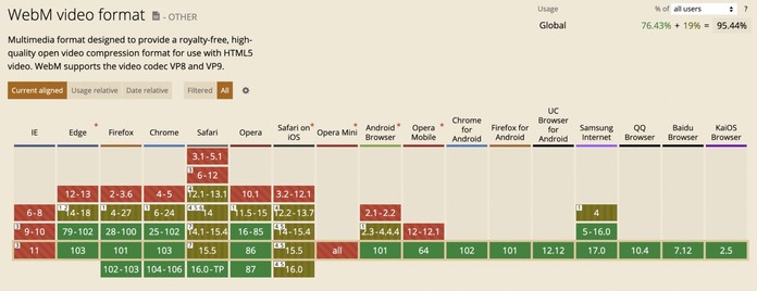 It can save up to 20-50% in size compared with H264 codecs retaining the same quality level. Every modern browser on desktop and mobile supports it, except Safari on iOS. Apple brought WebM support since macOS Big Sur to Safari on desktops, but to this day failed to make any progress on its mobile version.